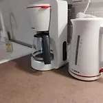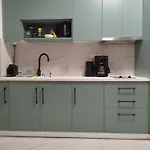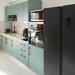Eine Küche mit einer Kaffee-/Teemaschine, einem Kühlschrank und Küchenutensilien gehört zur Ausstattung dieses Apartments für Selbstversorger. Die Bushaltestelle KTEA to Kalambaka befindet sich gleich neben der Ferienwohnung Habitat Lobby entfernt.